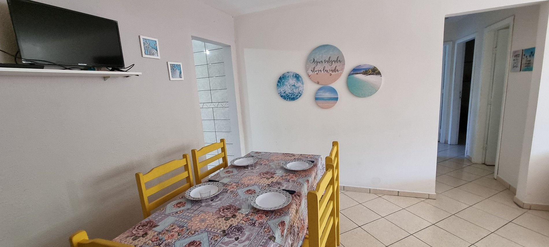 A cozinha é completa e equipada, pronta para preparar refeições deliciosas, enquanto a sala de estar com sofá e a sala de jantar oferecem um ambiente acolhedor para momentos de descontração. Na área externa, você encontrará uma churrasqueira compartilhada, ideal para noites de verão, além de uma ducha para refrescar-se após a praia e uma lavanderia para sua comodidade.