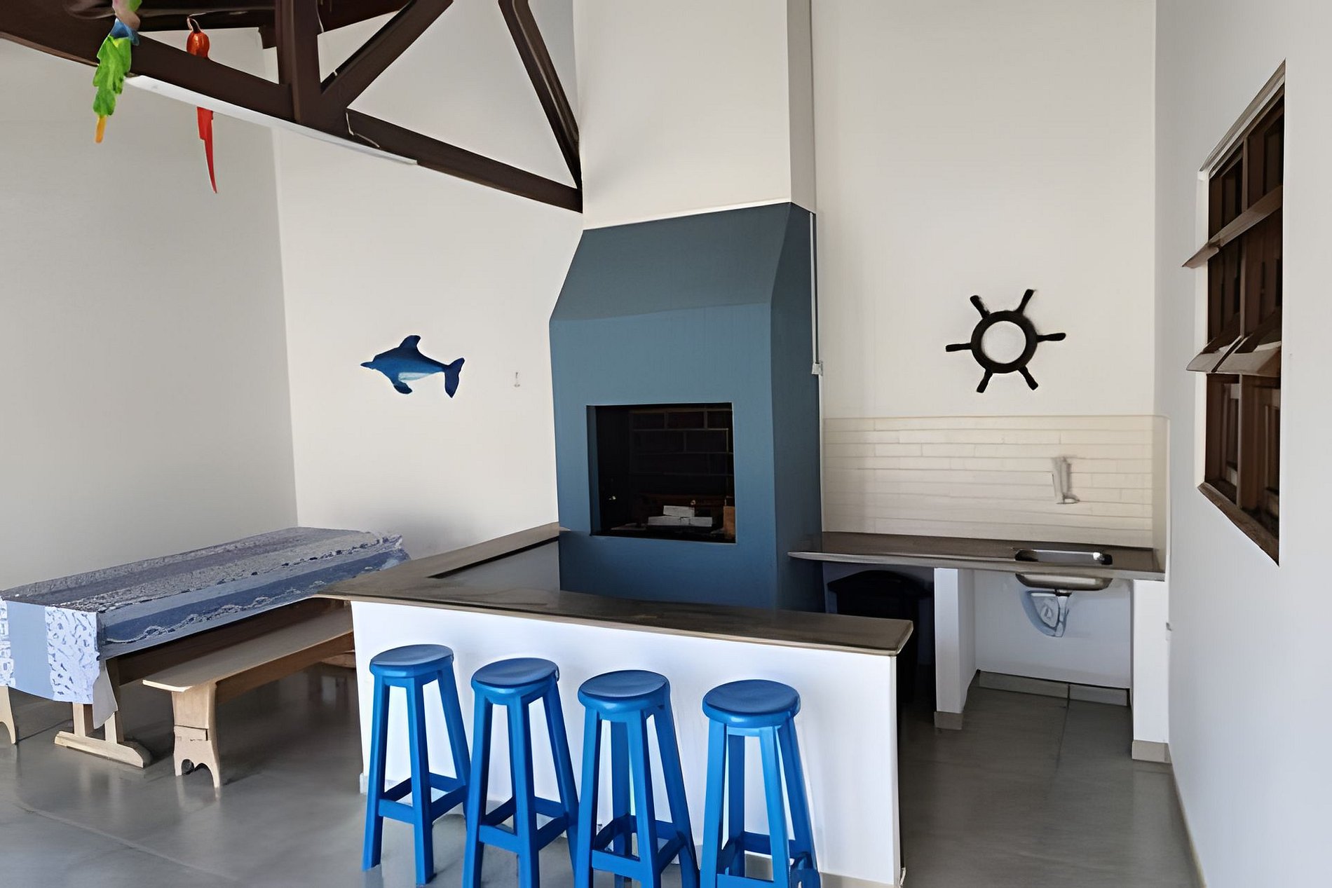 A área externa é um verdadeiro destaque: equipada com churrasqueira, ducha, lavanderia e uma mesa ampla para almoços e jantares ao ar livre, é o cenário ideal para reunir todos em momentos especiais. Além disso, oferecemos itens de praia, como guarda-sol e cadeiras, para você curtir ainda mais o seu passeio.